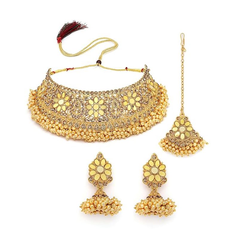 Gold Plated Gold Kundan & Beads Floral Choker Necklace Set With Earring And Maangtika